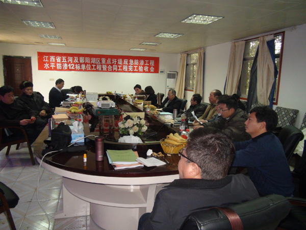 2012年1月10日,江西省五河及鄱陽湖區(qū)重點圩堤應(yīng)急防滲工程建設(shè)項目部在江西省共青城市主持召開了水平防滲12標單位工程暨合同工程完工驗收會,并順利通過了單位工程暨合同工程完工驗收。驗收會由省河湖局許盛豐主持。公司吳鐵凡總工程師、工程部郭洪有經(jīng)理參加了驗收會。
