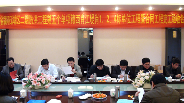 驗收會由江西省鄱陽湖區二期防洪工程第五個單項工程建設項目部副主任陶理志主持,建設項目部總工程師鄒軍賢、宜春市水利局劉啟明副局長、樟樹市水利局吳學輝、公司副總經理胡鴻煌等出席了驗收會。