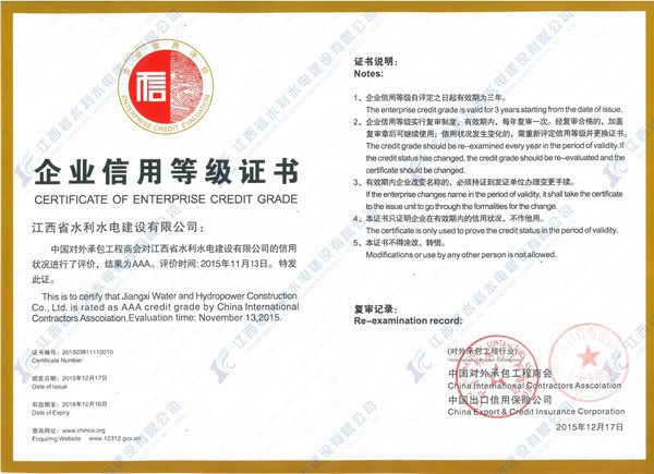 集團(tuán)資訊根據(jù)商務(wù)部、國資委聯(lián)合發(fā)布的《商會協(xié)會行業(yè)信用建設(shè)工作指導(dǎo)意見》和《關(guān)于進(jìn)一步做好行業(yè)信用評價(jià)工作的意見》的要求,結(jié)合承包商會關(guān)于推進(jìn)行業(yè)信用體系建設(shè)的工作部署,承包商會于2015年7月啟動2015年度對外承包工程企業(yè)與勞務(wù)合作企業(yè)信用等級評價(jià)工作,經(jīng)對外承包工程企業(yè)與勞務(wù)合作企業(yè)信用等級評審委員會第十一次工作會議審議,江西省水利水電建設(shè)有限公司被評定為2015年度對外承包工程企業(yè)信用評價(jià)AAA級信用企業(yè)。