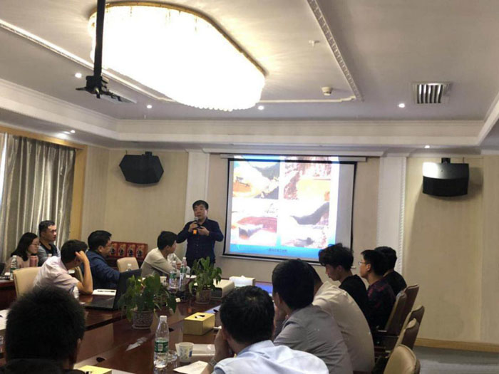 現場參觀結束后,學習團參加了技術培訓和經驗交流會??偨浝碇矶帕柚鞒至碎_班儀式。總工程師胡鴻煌、項目副經理李成,對洋前壩水庫的大壩總布置、大壩施工導流、大壩及供水管道施工技術細節等,通過文字、圖片、視頻等組成的PPT課件為學員授課,并就學員提出的問題逐一進行了解答。