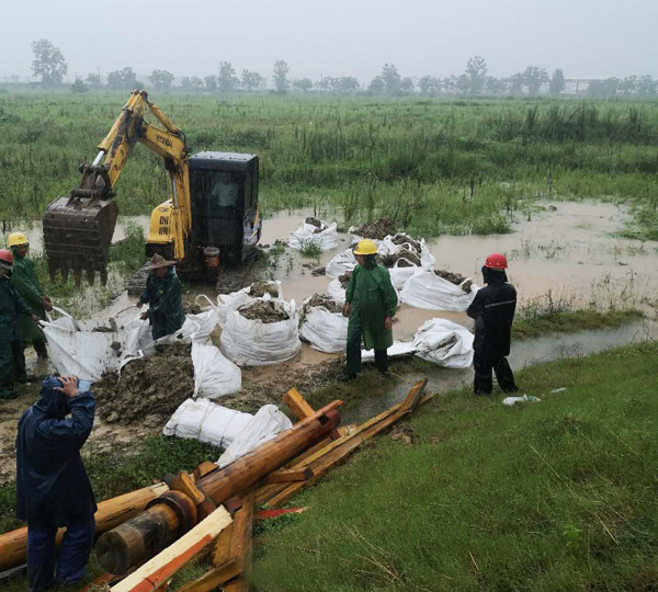 進入7月以來,昌江河流域普降暴雨,橋溪水河水位大漲。7月7日,公司接到業(yè)主汛情通報,已完工驗收工程多處出現(xiàn)險情;汛情就是命令,時間就是生命,公司迅速組建了一支裝備精良、經(jīng)驗豐富的專業(yè)搶險突擊隊,由副總經(jīng)理曾朝文、總經(jīng)理助理杜凌帶隊,連夜奔赴浮梁抗洪一線,組織設(shè)備、人員、材料進場,進行搶險救災(zāi)工作。
